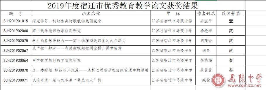 2019年度宿迁市优秀教育教学论文获奖结果